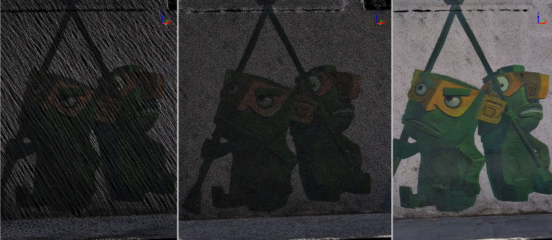 The left image shows the normal mode output, the middle shows the high-density output mode, and the right image shows the 2mm high-density output mode. Generally speaking, the point cloud density of high-density mode and high-density mode (2mm) output mode is 4-10 times more than that of the normal mode. Please pay attention to the disk consumption;
