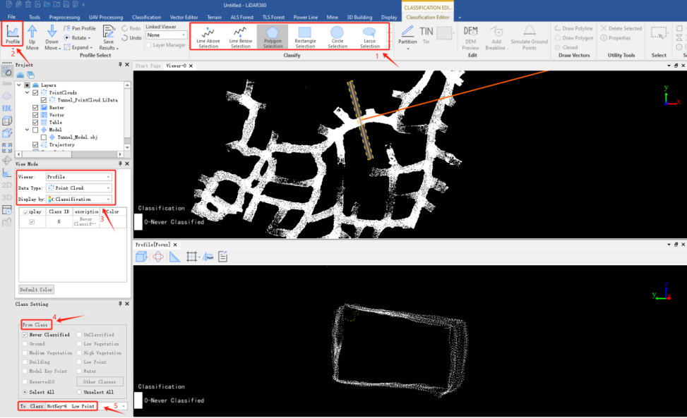 3. Manual noise removal. Classification - Classification Editor - Profile, after setting the "From Class" and "To Class", use the selection tool to classify points that do not participate in volume calculations as low points, such as shadows inside the mine tunnel