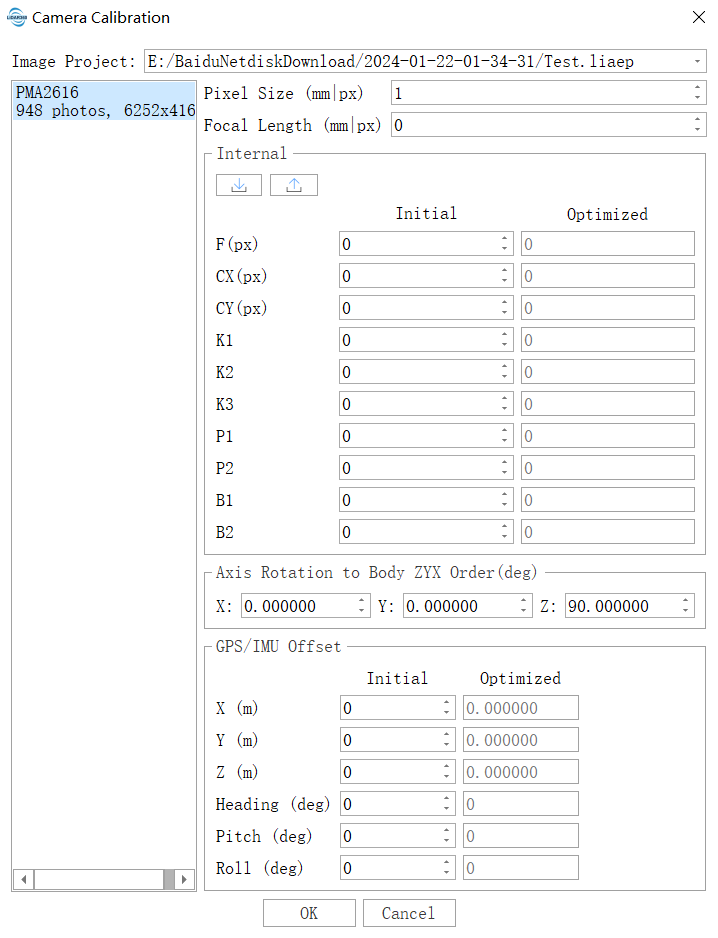 - Select the image project that needs camera calibration. Only image project files that have been opened in the software are supported.