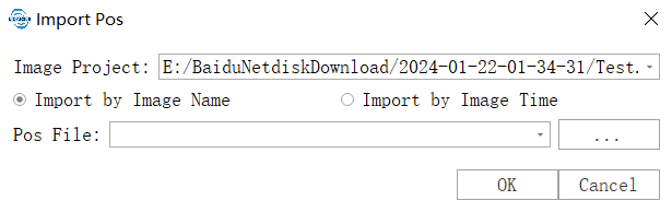 Click the "Import POS" button. First, select the project file to import the POS into from the dropdown list (only project files that have been added to the software can be selected). Then, based on the format of the POS to be imported, choose to import by filename or by time. Importing by filename means the POS file contains a column with the corresponding image names, which can be matched with each image. Importing by time uses the camera shutter time file (.cam) and trajectory file (.traj) to interpolate the trajectory and determine the camera's POS information.