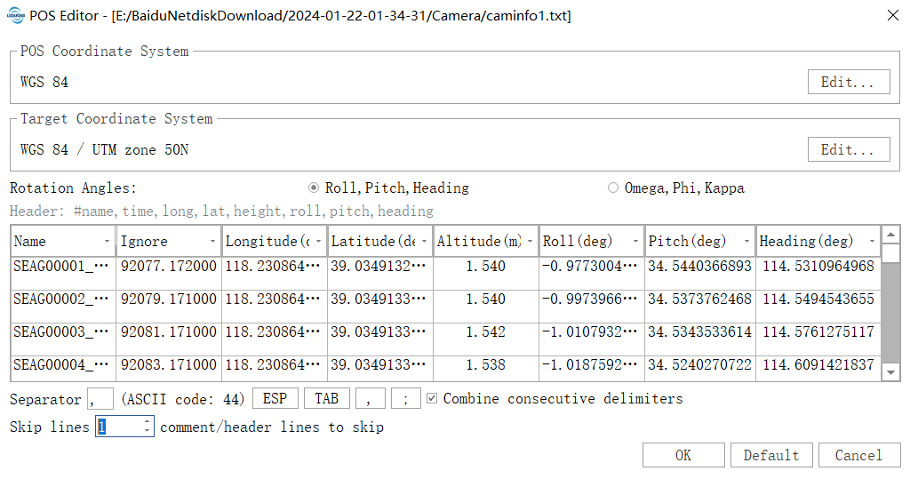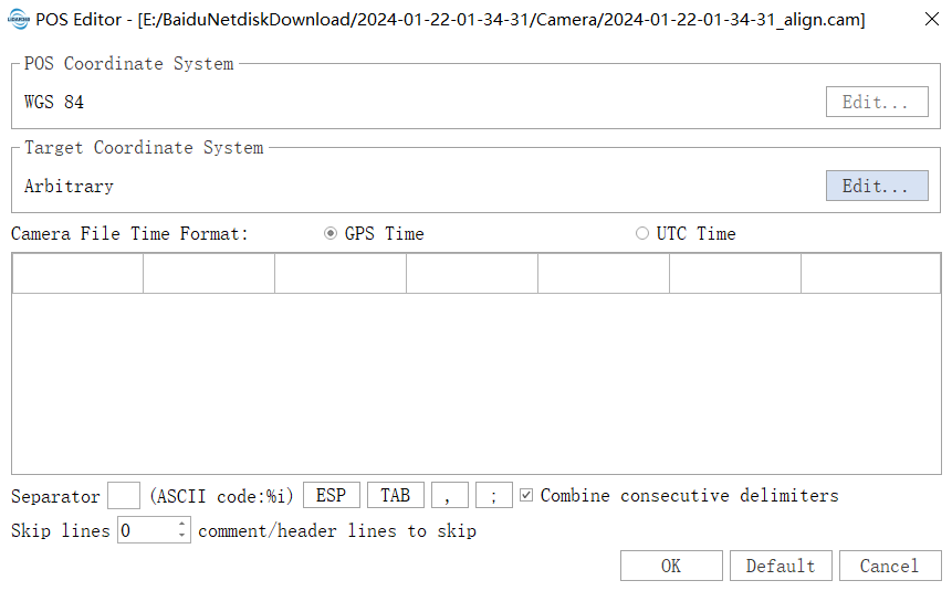 - Separator Adjustment: If the file data is not displayed correctly in the table, adjust the separator (optional). If the POS file is not displayed effectively in the list after loading, adjust the separator at the bottom of the table to effectively separate and display the data. Currently, TAB, "\t", "\n", "," separators, and combinations of these separators are supported. By default, POS data will be separated using combined separators. If the file separator is not among the four types mentioned above, you can enter an appropriate separator in the separator text box to effectively divide the data.