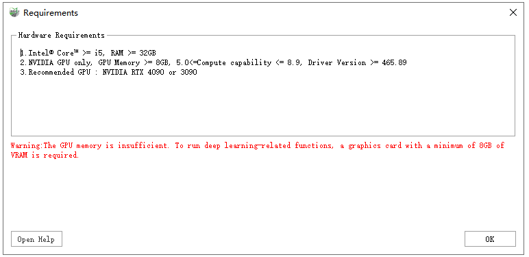- When the hardware requirements are not met, there will be a red warning prompt, such as: insufficient memory; Insufficient GPU memory; Insufficient GPU compute capability. Need to upgrade computer hardware, add memory modules, and replace graphics card.