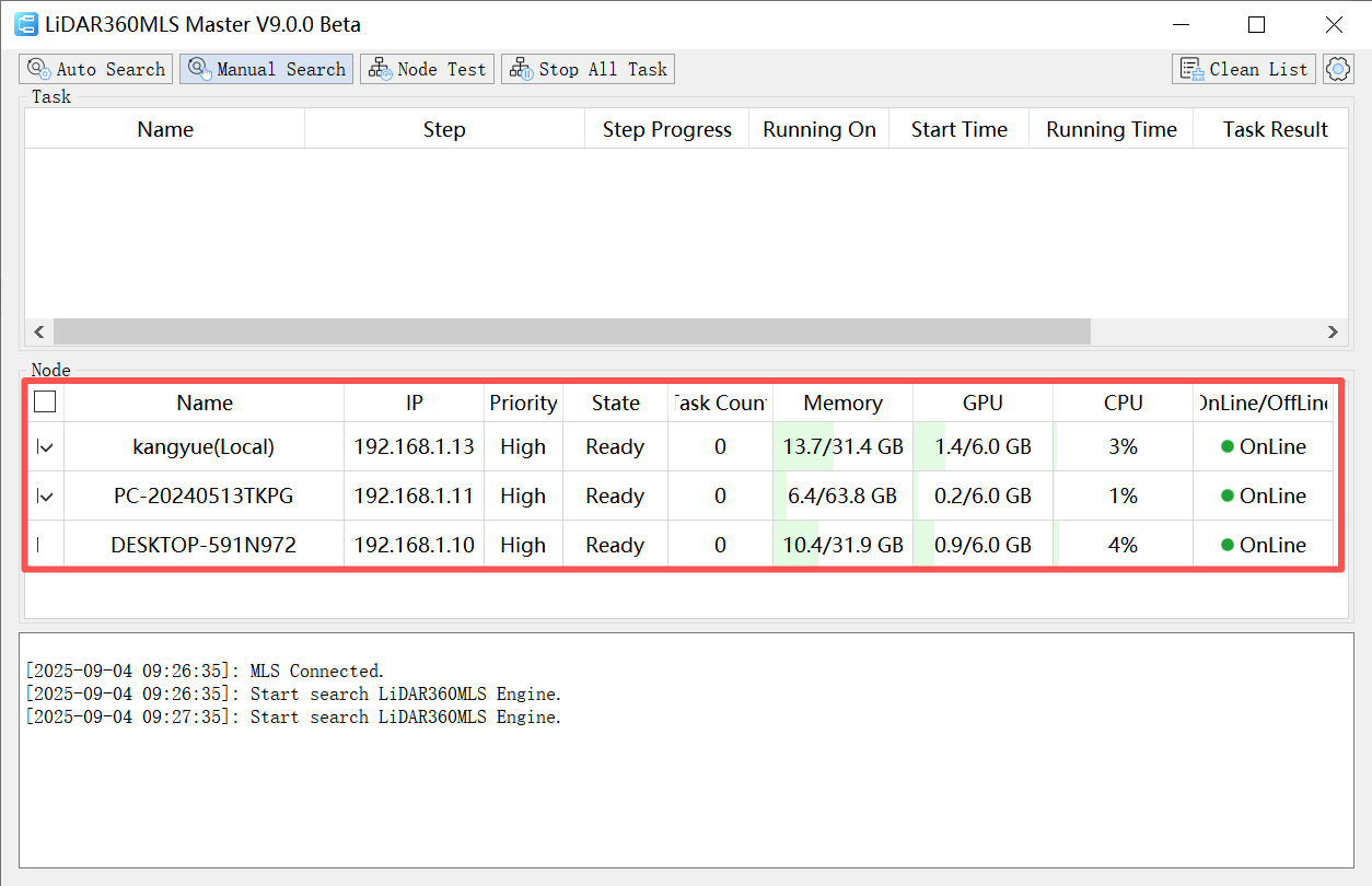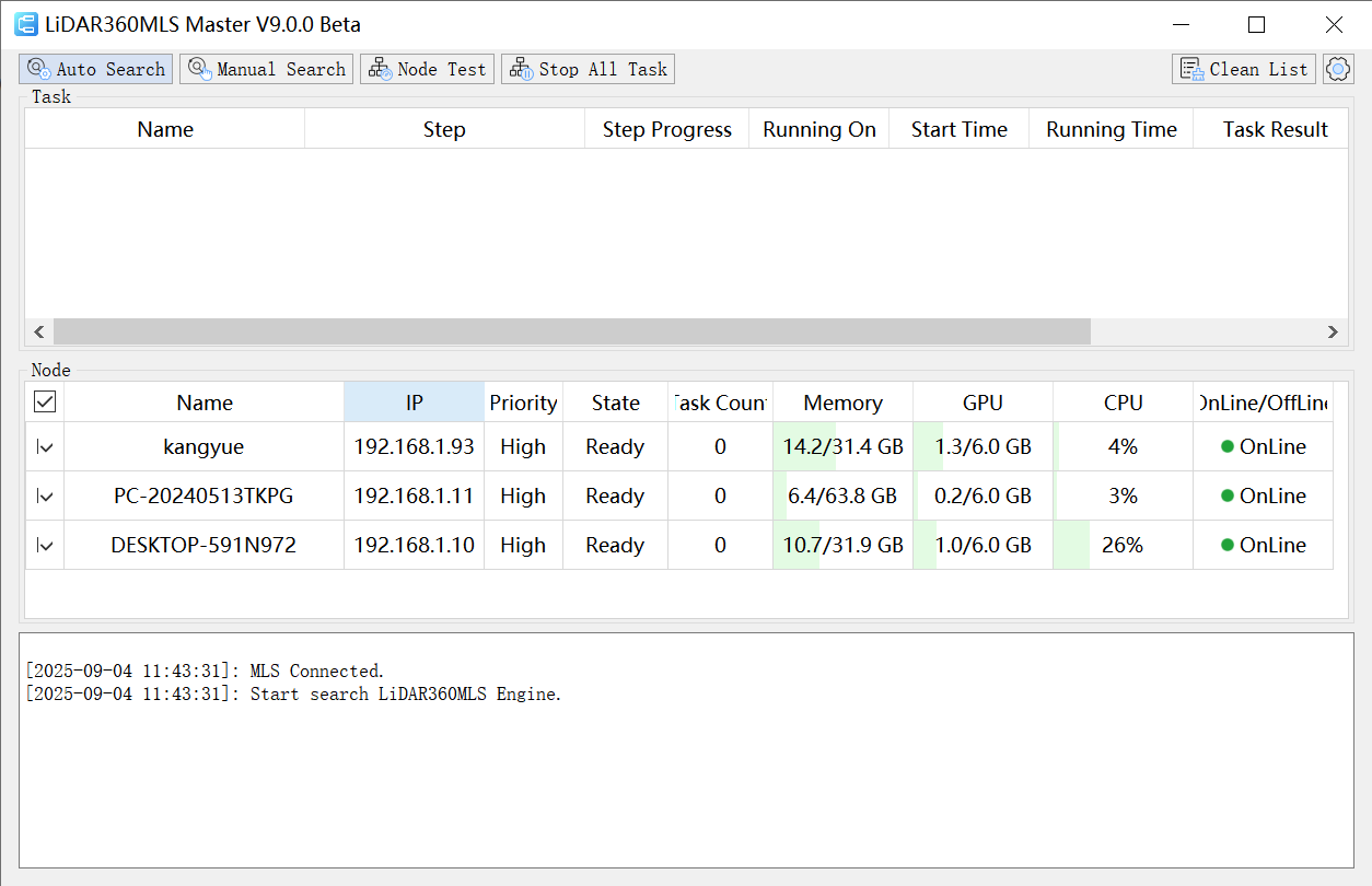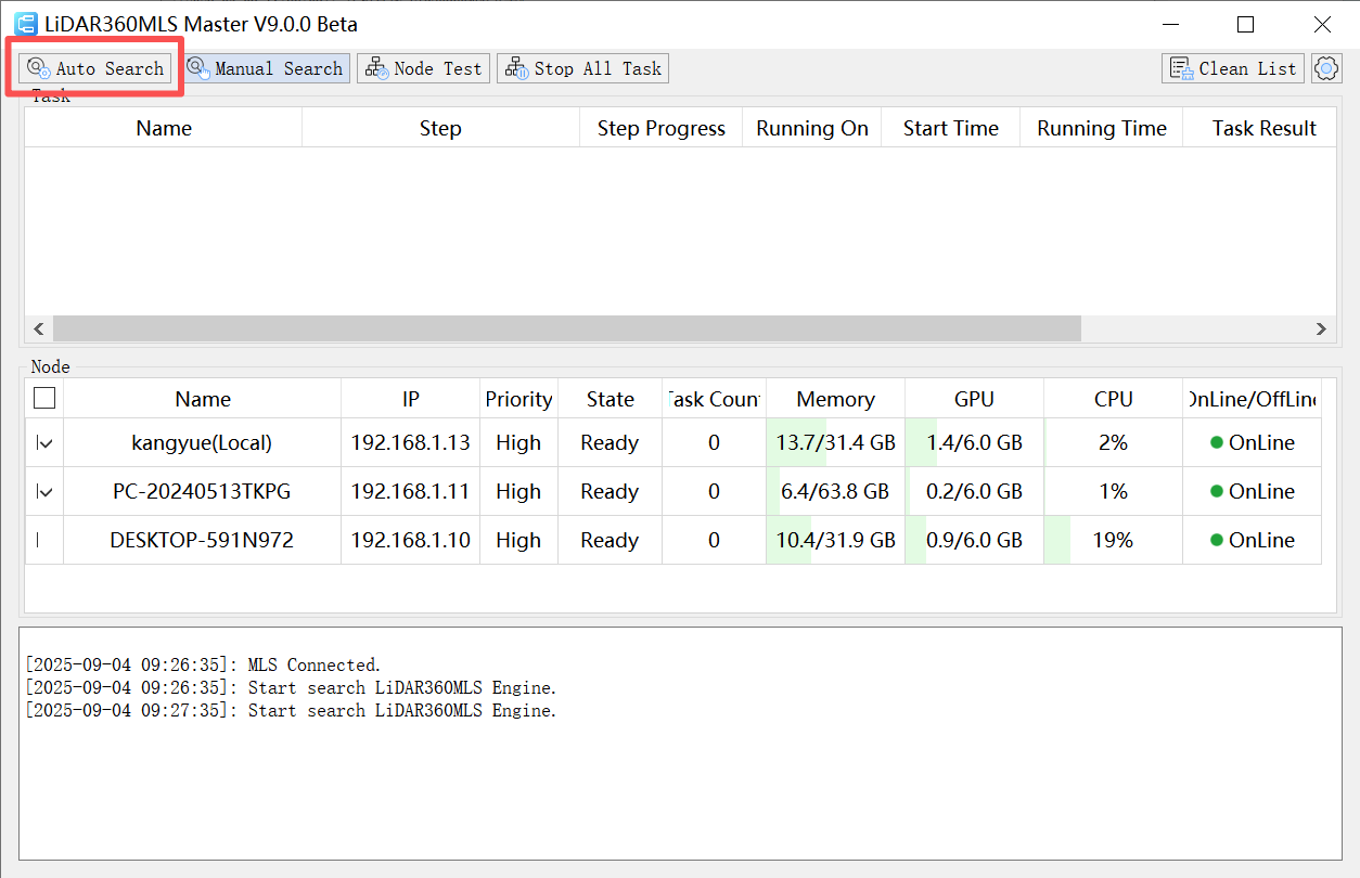 3.On the LiDAR360MLS Master Node V9.0 interface, click the Auto Search button to locate all worker nodes within the local area network.