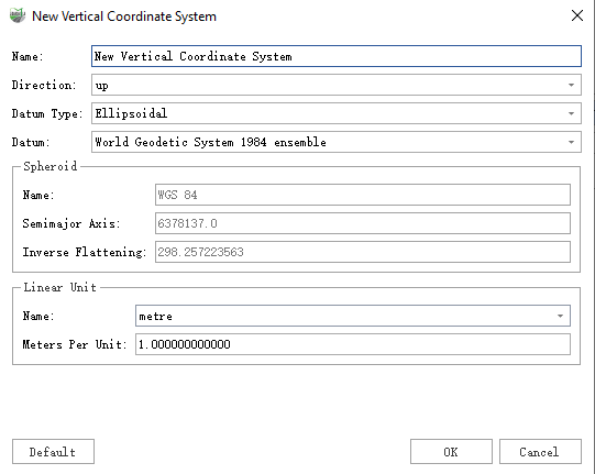 - Datum Type: Sets the datum type of the vertical coordinate system. Ellipsoidal is an ellipsoidal datum and Gravity-related is a gravity field datum.