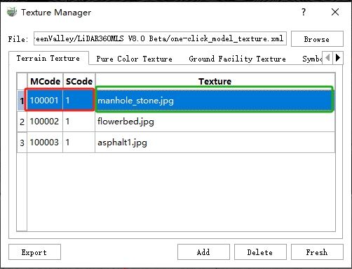 - Delete: Delete a record (including MCode, SCode, and complete texture record).