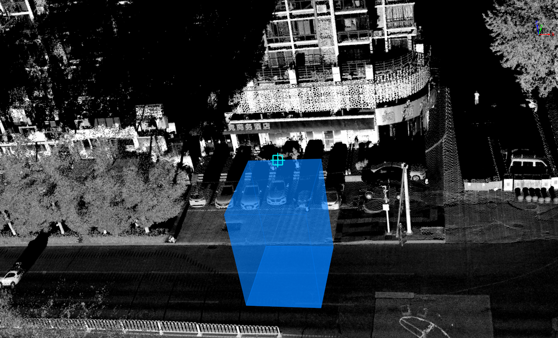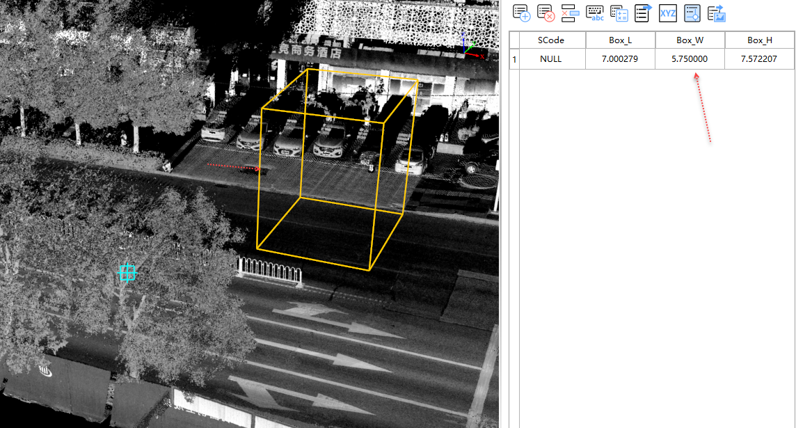 - Left-click to select the second key point, determining the width of the base rectangle. The second point selection snaps to the horizontal plane of the first point and no longer relies on the point cloud. Example: