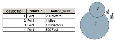 When using a field from the input to obtain buffer distances, the field's values can be either a number (e.g., 5) or a number with a valid linear unit (e.g., 5 kilometers). If the field value is a number, the distance is assumed to be in the linear unit of the input's spatial reference (unless the input uses a geographic coordinate system, in which case the value is in meters). If the specified linear unit in the field value is invalid or unrecognized, the input's spatial reference linear unit will be used by default.